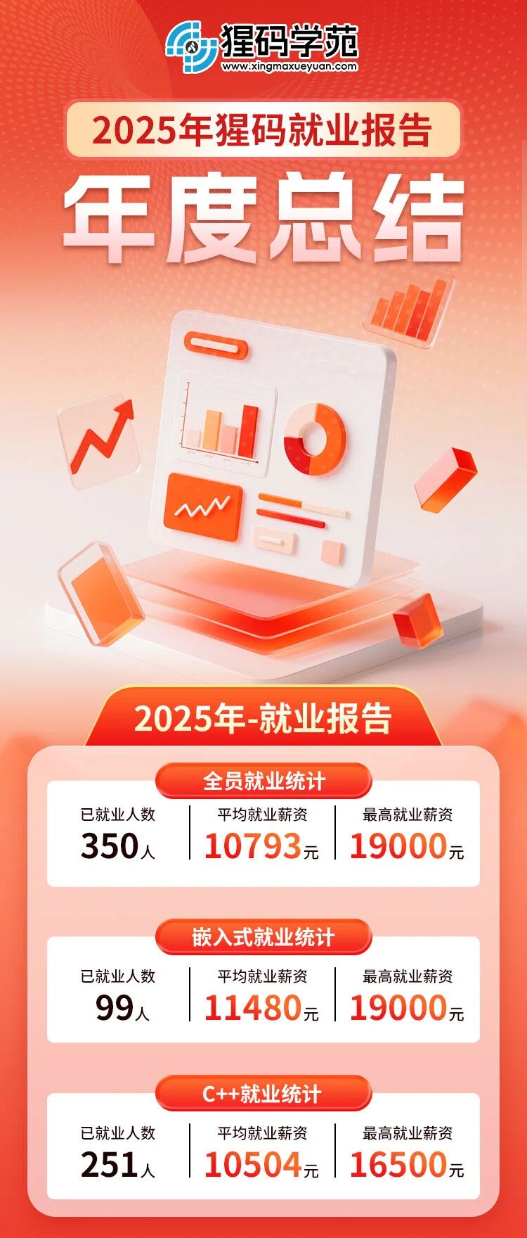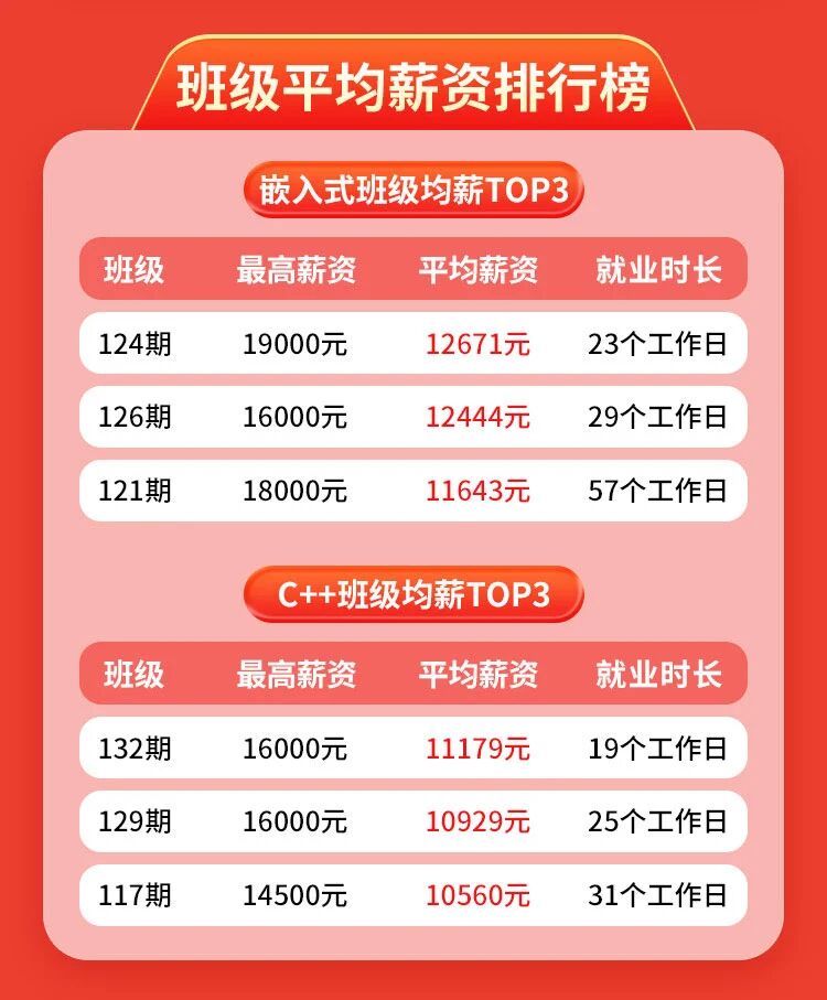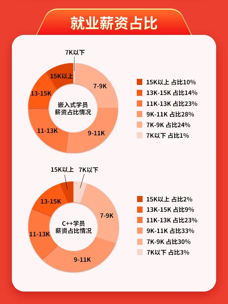 大家好,我是霸哥。 大家都知道,2025年互联网行业分化明显,不少求职者面临就业难题,但C++、嵌入式开发领域始终刚需缺口大。作为专注C/C++赛道的机构,猩码以务实育人为初心,陪伴学员用技术逆袭。今年发布2025年就业年度报告,用真实数据,为想进入C/C++领域的你提供一份务实参考。 关于猩码学苑 猩码学苑是菁英科技旗下专注于C/C++开发、嵌入式应用、智能体研发等领域技术实习、项目实训、师资培训、人才培养的职业教育品牌。创立至今,已为华为、京东、AMD、神州数码、海康威视、宇视科技、大华股份、烽火通信等公司提供了数千名优秀软硬件开发技术人才。猩码的初心就是帮助有志青年学到企业实用技能,摆脱“学完即失业”,用代码改善生活。 25年猩码就业整体情况 今年总共有350位学员完成培训并顺利就业。整体平均薪资10793元/月,最高薪资19000元/月。其中嵌入式方向99人,平均薪资11480元/月;C++方向251人,平均薪资10504元/月。 不难看出嵌入式方向薪资确实略高,这和该领域的行业门槛较高、优质人才稀缺密切相关。 从班级表现来看,嵌入式124期表现尤为突出,班级平均薪资12671元/月,该期学员最高薪资达到19000元/月;C++132期同样表现出色,平均薪资11179元/月,最高薪资16000元/月。结合班级表现和整体数据,我们再看看具体的薪资分布情况。 薪资分布上,嵌入式方向有超70%的学员拿到9k以上薪资,其中10%的学员薪资达到15以上;C++方向有超65%的学员薪资在9k以上。大部分学员的薪资集中在9k-13k区间,属于行业内比较务实的薪资水平。 除此之外我们也整理了多元群体及西安本地就业数据,铺盖不同学历、身份、性别的学员,真实呈现各类群体的就业表现: 本科生是今年主力群体,占比最大,平均薪资10797元/月,最高19000元/月,可见学历够用、技术扎实,找工作无需发愁; 研究生平均薪资12497元/月,最高16500元/月,学员学习主动、项目质量高,就业速度和薪资表现都很出色。 专科生人数不多,平均薪资8818元/月,最高13500元/月,只要技术过硬就能获得充足机会。 应届生平均薪资9304元/月,最高14719元/月,不少考研失利、秋招错过的应届生,经过数月培训后上岸成功,薪资优于直接就业的同学。 非科班(跨专业转行)学员数量可观,多为机械等工科类专业,平均薪资10987元/月,最高16000元/月,只要数学、逻辑能力过关、肯下功夫,转行完全可行,嵌入式和C++开发入门虽难,但职业生命周期长; 今年学C++和嵌入式方向的女生比往年多了一些,平均薪资11999元/月,最高17000元/月,高于整体平均水平,技术行业不分男女,细心认真的女学员,就业表现不输于男生。 城市就业方向,西安本地就业表现突出,就业城市占比29%,学员平均薪资9444元/月,最高16000元/月。近年来西安IT及制造业发展迅速,本地就业机会大幅增加,不少原本计划前往北上广深的学员,考虑到本地薪资可观、生活成本较低,选择留着西安就业。 贴合市场刚需,瞄准行业风口 结合猩码25年学员就业情况及行业趋势,霸哥整理出这四大热门就业方向,这些方向需求大、薪资优、发展好,也是猩码就业学员最集中的领域: 第一个热门方向是人工智能与机器人领域,该领域2025年就业需求持续上涨,C/C++作为底层开发语言,是算法落地、机器人硬件驱动开发的核心支撑,企业需求旺盛。 第二个热门方向是汽车电子领域,随着新能源汽车、智能驾驶发展,该领域成为就业蓝海,C/C++是车载系统、车规级芯片驱动的核心语言,猩码部分学员就职于车企及配套企业,薪资涨幅可观。 第三个热门方向是工业领域,传统制造业向智能制造转型,带动C/C++人才需求回暖,猩码就有部分学员就职于自动化、智能制造企业,岗位稳定性强,薪资稳步提升。 第四个热门方向是航天军工与半导体领域,作为国家核心战略方向,对技术要求极高,C/C++是核心开发语言,不少学员成功入职相关企业,薪资稳定,职业荣誉感强、发展前景广阔。 关于猩码的就业数据,大家想知道的三个问题 1.猩码学苑这些平均最高就业薪资是不是真的? 猩码所有学员就业薪资透明,就业薪资数据均来自学员真实offer,猩码在西安有实体校区,欢迎上门了解考察。所有就业学员的就业真实offer及薪资情况均已存档,也可以安排与就业班级及已就业学员交流了解,坚守合规经营底线,不虚假宣传。 2.C++/嵌入式开发,真的能拿到这么高的工资吗? C++/ 嵌入式之所以高薪,核心是技术门槛高、行业刚需大,绝非夸大宣传。新能源汽车、工业物联网、智能家居、医疗设备等行业都在大量要人。行业越来越看重真本事,只会基础操作的初级岗位逐渐缩水,懂底层、能实战的中高级人才更吃香,职业寿命更长、更稳定。 市场数据(职友集近一年统计)嵌入式全国平均约18K/月,C++开发约20K/月,中高级岗位普遍25K-40K。学员真实就业:嵌入式最高19000元,C++开发最高16500元,起薪明显高于普通IT岗位。 猩码课程优势相比其他机构,猩码不做浅层教学:嵌入式开发课程:不只教市面上的STM32基础,深度讲ARM架构,直通中高级岗位。C++开发课程:不只教语法,从项目实战出发,教你写稳定、高效的工业级代码。掌握ARM+C/C++,起薪更高,上手就能做核心项目,薪资涨幅更明显。 3.相比其他机构,为什么猩码学员的就业薪资更高?核心优势在哪里? 核心原因有两点:一是行业门槛高,优质C/C++人才稀缺,不像前端、测试那样门槛低。制造业、军工、半导体这些