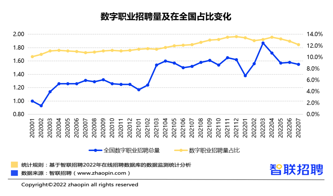 2022年可以说是史上就业压力最大的一年,一方面疫情影响企业控制成本裁员不断,另一方面就业人数不断增加,岗位缩减严重,就业形势异常严峻,但随着疫情政策的放开,2023年也如约而至,从春节假期的旅游状况看来,经济已经慢慢“活”了过来,2023年就业市场是否会有好转?霸哥结合一些数据给大家看看。 数字经济推动岗位需求增长 之前颁布的《中华人民共和国职业分类大典(2022年版)》中标注了“数字化解决方案设计师”、“数据安全工程技术人员 ”等97个数字职业,根据智联招聘平台数据监测发现,数字职业的招聘量在整体职位招聘中占比均呈上升状态,2022年1-7月的数字职业招聘量比2020年增长37.5%,可见数字经济的发展推动了相关技术人才的需求也不断增长。 传统行业转型需借助互联网 近年来,大家也能明显地感受到互联网让大家的生活越来越便捷,疫情三年也加速了互联网行业的发展,很多传统行业也在不断转型发展,那么在转型的过程中就需要更多的技术支持。 2022年中央经济工作会议指出,平台经济应该着力与实体经济相结合,赋能实体企业,加强技术创新,推动互联网更高效率发展,这也意味着在传统行业转型的过程中需要更多的技术支持,对应地也就会释放出更多的岗位需求。 技能型人才需求稳定增长 智联招聘显示,即使在疫情影响的前提下,2022年企业对于技能类、研发类岗位的需求占比依旧持续增长,从2021年的16.34%上升到2022年的21.39%,增长趋势明显。 在最常见的职位中,软件工程师、网络开发工程师、前端开发工程师、数据分析员、全栈工程师占比比较大,也说明了这些岗位在互联网的发展中起着重要的作用,不可或缺的存在,这也说明在2023年相关岗位的招聘量也会有所增长。 总之,霸哥坚信,经历了2022年的就业冷门,随着疫情政策的放开,经济一定会恢复到疫情之前的状态,大家的生活正在重新启动,所以新的一年也要元气满满地应对各种机遇与挑战。 猩码学苑是一家专注做前端开发的培训机构,无论你是零基础转行前端开发还是想提升部分技术水平,在猩码学苑都能学到你想要的知识内容,猩码学苑也汇集多位资深经验的前端讲师为学员传授专业的课程体系,专业全面的就业服务体系为你的学习生活保驾护航,来到这里你只管好好学习,其他一切都交给教学和就业老师!新的一年打起十二分的精神,抓住疫情恢复后的第一波就业潮,为自己的搏一份好前程!