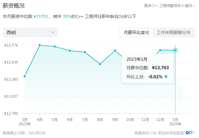 二、C++开发前景 C++开发薪资情况数据显示,以西安为例,截止2023年1月,薪资中位数为13703元。这个薪资水平是非常可观的,因为这仅是中位数,只要技术到位,拿到比这个数字更高的水平自然不在话下。 除了薪资之外,C++开发的应用场景和就业范围也很广。基本上所有大厂都会用到C++开发。单是就业方向就有5个大类,细分的话就有有数十种了。